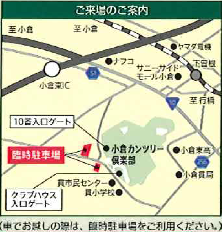 ※臨時駐車場の場所につきましては、小倉カンツリー倶楽部を目指してお越しいただくと、現地に誘導看板を設置しています。