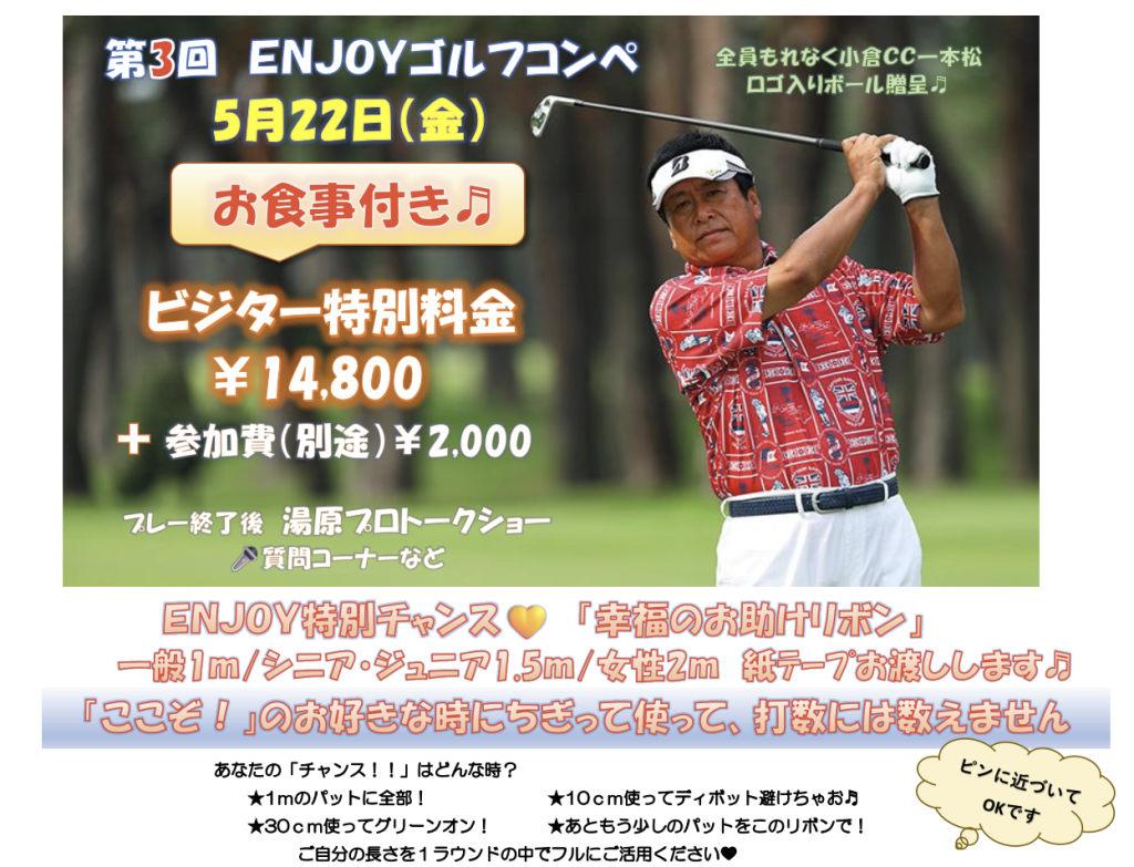 【第3回】湯原プロ監修!オープンコンペ開催のお知らせ このたび、小倉カンツリー倶楽部では湯原プロ監修のもと、「第3回 ENJOYゴルフコンペ」を開催いたします! 本コンペは、メンバー様はもちろん、ご紹介がなくてもビジター様を含めどなたでもご参加いただけるオープンイベントです。 参加者全員にランチと当倶楽部オリジナルゴルフボールをプレゼント! また、プレイ後には湯原プロによるトークショーもございます。 今年初開催となる特別なコンペに、ぜひご参加ください。 皆さまのご参加をスタッフ一同、心よりお待ちしております。
